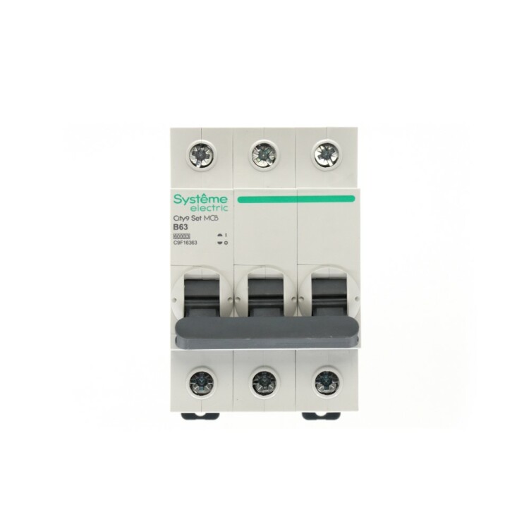 Автоматический выключатель серии City9 Set Systeme Electric, 3-полюсный, номинальный ток 63 А, характеристика B, Icn = 6 кА. Применяется в электрических сетях напряжением 400 В. Предназначен для защиты от перегрузок и токов короткого замыкания. Оснащен механизмом «мгновенной коммутации». Ударопрочный корпус из специального пластика с 6 металлическими заклепками. Безопасные клеммы исключают попадание кабелей в заклеммное пространство.