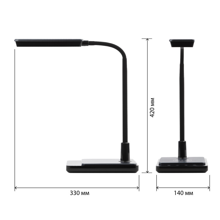 Настольный светильник ЭРА NLED-499-10W-BK со светодиодами (LED) в качестве источников света. Оснащен сенсорным управлением с возможностью выбора цветовой температуры (теплый, нейтральный или холодный свет). Плавный диммер для регулировки яркости. Светильник сохраняет выбранные настройки при включении-выключении. Направление света регулируется наклоном и поворотом плафона в любом направлении. Светильник имеет встроенный модуль Qi для беспроводной зарядки мобильных устройств. Просто положите телефон, поддерживающий функцию Qi, на основание светильника в отмеченной зоне - светильник подзарядит его удобно и быстро.
