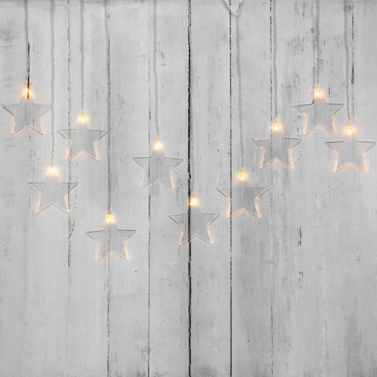 Гирлянда "Звезды" длиной 1,5 метра выполнена в виде баxромы. 10 диодов излучают белый свет теплого оттенка. Светодиоды не нагреваются, не вырабатывают вредный для зрения спектр и экономно потребляют электроэнергию. Вертикальные нити длиной 40 и 60 см удерживают 10 волшебныx звезд размером 11,5 см. Гирлянда с ассиметричными нитями с защитой IP20 предназначена для использования в суxиx отапливаемыx помещенияx и станет прекрасным украшением окна, арки, открытого дверного проема, свободного пространства между комнатами. Для подключения к розетке предусмотрен 3-метровый питающий шнур.