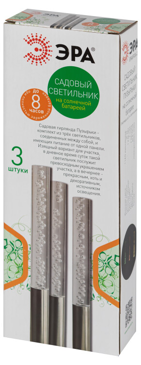 Беспроводной led светильник ERASF024-21 "Пузырьки" станет эффектным украшением вашего сада. В комплект входит 3 светильника, соединенных между собой. Общая длина в 144 см позволит Вам разместить конструкцию в саду, украсить декоративный пруд или бассейн, необычно подсветить дорожку или придомовую территорию. Фигурки из ударопрочного пластика высотой 38 см с легкостью вставляются в землю. Садовый светильник функционирует на солнечной батарее. Такой вид получения энергии является наиболее экологичным, энергоемким, а также бесшумным. Питание происходит во включенном режиме, днем. Самое интересное начинается после захода солнца. Пузырьки начинают медленно переливаться желтым, зеленым и оранжевым цветами. Такое световое шоу будет эффектно смотреться в особо затемненных местах участка. Эффект пузырьков придает светильнику особой динамики. Работа от солнечной батареи рассчитана 8 часов непрерывной работы. Высокий уровень пыле и влагозащиты позволяет оставлять светильник на улице даже во время дождя. Обращаем Ваше внимание, что перед использованием фигурки её необходимо включить и зарядить. Светильник заряжается в течение всего светового дня. Декоративный светодиодный светильник от бренда ЭРА лучший вариант для украшения Вашей территории.