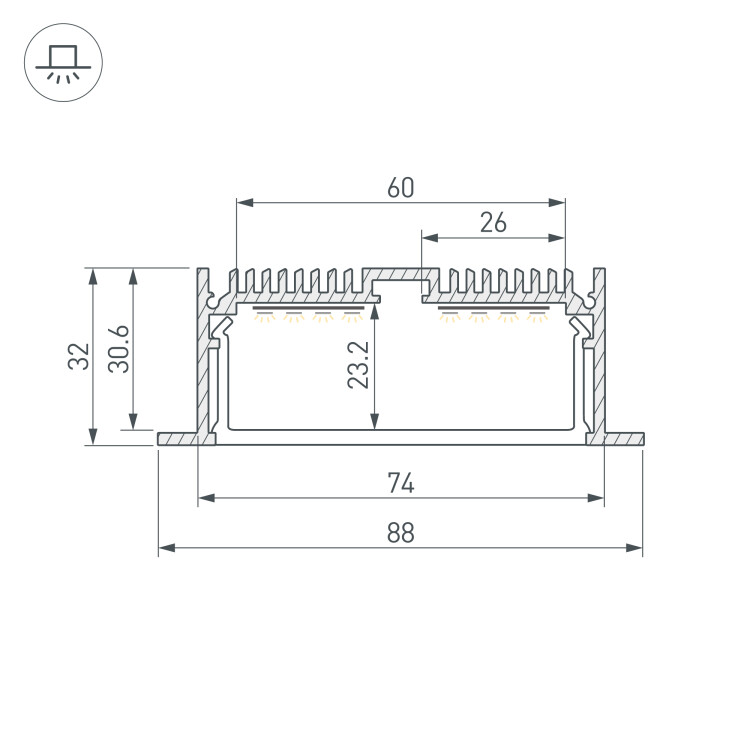 Комплект с экраном. Алюминиевый анодированный профиль для светодиодных лент и линеек. Габаритные размеры (L×W×H): 2500x88x32 мм, паз для установки 74 мм. Ширина площадки для ленты 60 мм. Аксессуары приобретаются отдельно.