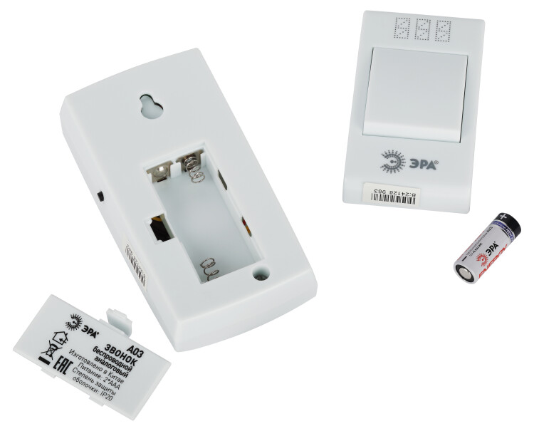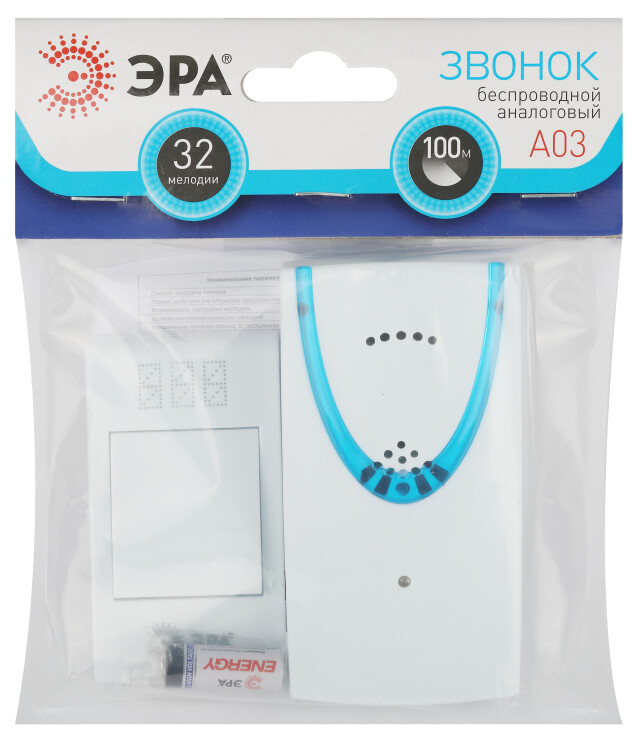 ЭРА А03 - беспроводной аналоговый дверной звонок универсального дизайна в легком прочном корпусе базового бело го цвета. Доступны 32 полифонические мелодии, их можно менять под настроение - звонок никогда не надоест. Работает от 3 мизинчиковых батареек (3 х ААА). Простой и лаконичный корпус звонка в белом цвете смотрится элегантно. Не нужно подключение к электросети, быстро монтируется в любое удобное место. Радиус действия - 100 метров. Этот звонок от компании ЭРА будет служить Вам долго.