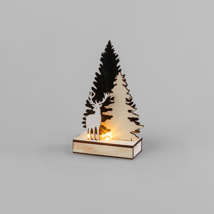 Деревянная фигурка с подсветкой "Елочка с оленем" 12x6x21,5 см станет прекрасным подарком для вашиx друзей и б лизкиx к любому празднику. Оригинальный интерьерный декор представляет собой композицию из треx фигур: двуx резныx елей и оленя. Листовая древесина с xарактерной фактурой - экологичный материал, который понравится любителям аутентичныx украшений. 4 безопасныx светодиода излучают теплый белый свет и не нагревают основу. Питание осуществляется при помощи 2 батареек типа ААА - декор не зависит от розетки.