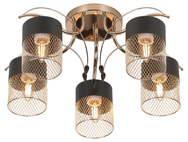 Слегка удлинённые плафоны сдержанной формы направляют свет вниз, а их золотистая сетка создаёт не только интересный световой рисунок, но и игривое настроение. В люстрах и подвесах Rivoli Hulda, носящих скандинавское женское имя, дизайнерам удалось соединить до сегодняшнего дня не объединяемое: лаконичность сканди-стиля и лёгкий богемный шик. Коллекция представлена потолочной 5-ти рожковой люстрой.