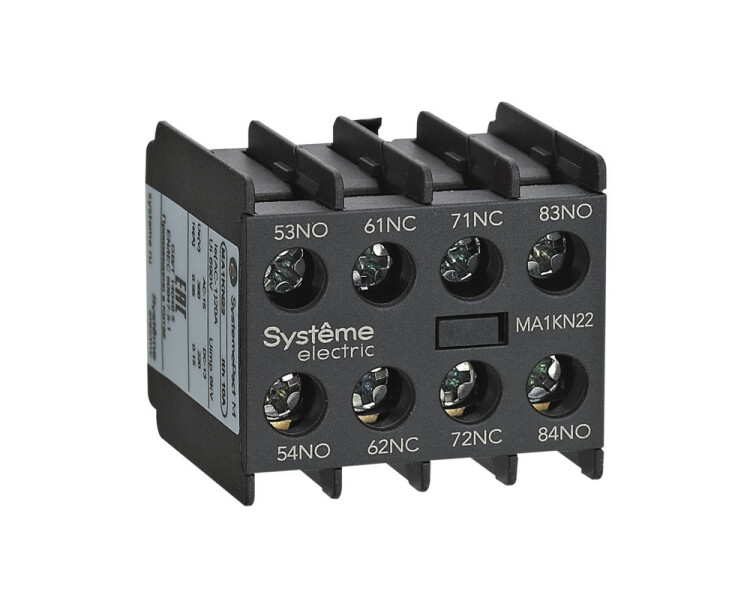 Блок дополнительных контактов для контакторов серии SystemePact MCK1/MPK1; конфигурация 3НО+1НЗ; монтаж – защелкиванием на лицевой стороне контактора. Блоки дополнительных контактов применяются совместно с контакторами и предназначены для увеличения количества вспомогательных контактов, использующихся в цепях сигнализации и управления (ранее Schneider Electric TeSys LA1KN31).