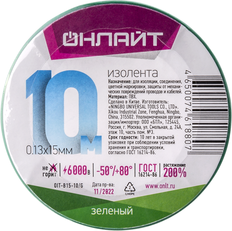 Изолента ОНЛАЙТ 61 880 OIT-B15-10/G ПВХ зеленая (Китай)(кр.1шт)