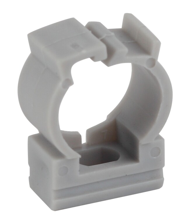 Используется для крепления гофрированных и гладких труб к поверхности стен или потолка. Для крепления к поверхности в крепёж-клипсе предусмотрено технологическое отверстие под саморез или дюбель.