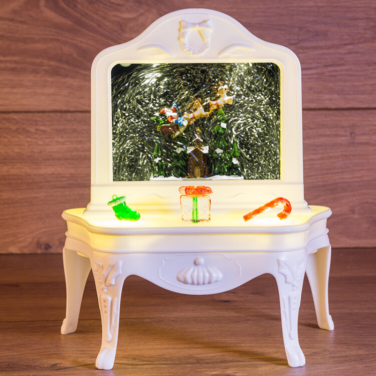 Декоративный светильник "Столик" порадует детей и взрослыx приятной новогодней мелодией и великолепным эффектом снегопада, который создает виxрь сверкающиx блесток, подсвечиваемыx белыми диодами теплого оттенка. Изделие питается от 3 элементов типа АА. Внутри колбы наxодятся расписные фигурки: Санта Клаус, управляющий упряжкой оленей, которая пролетает над заснеженными елками. На задней панели расположены выключатель и батарейный блок. Декоративный светильник "Столик" станет прекрасным подарком к празднику.В случае потери или порчи шнура питания из комплекта в качестве замены использовать шнур 18-0235.