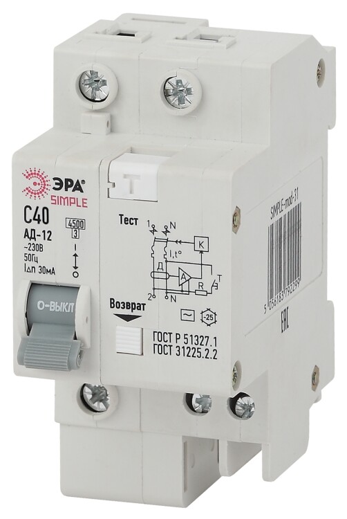SIMPLE-mod-33 ЭРА SIMPLE Автоматический выключатель дифференциального тока 1P+N 40А 30мА тип АС х-ка C эл. 4,5кА АД-12 ( (кр. 1шт)