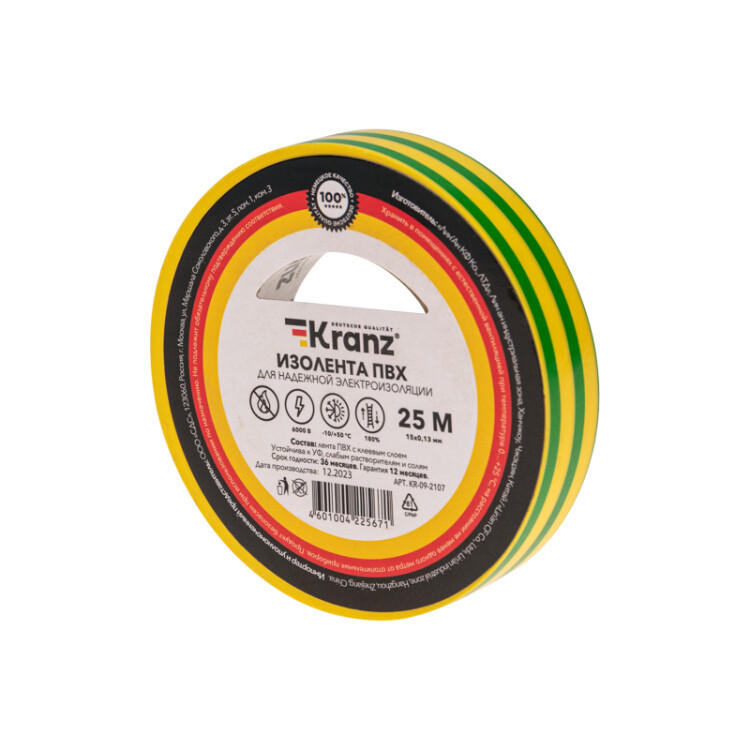 Изолента ПВХ 0,13х15мм, 25м, желто-зеленая KRANZ (кр. 5 рул)