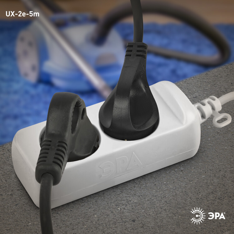 Компактный бытовой удлинитель ЭРА UX-2e-5m с заземлением и удобной вилкой с кольцом. Длина шнура - 5 метров, 2 розетки. Позволяет подключать электроприборы с максимальной нагрузкой 10 А/ 2200 Вт. Этот надёжный и безопасный удлинитель изготовлен из негорючих материалов и имеет трёхжильный медный провод ПВС.