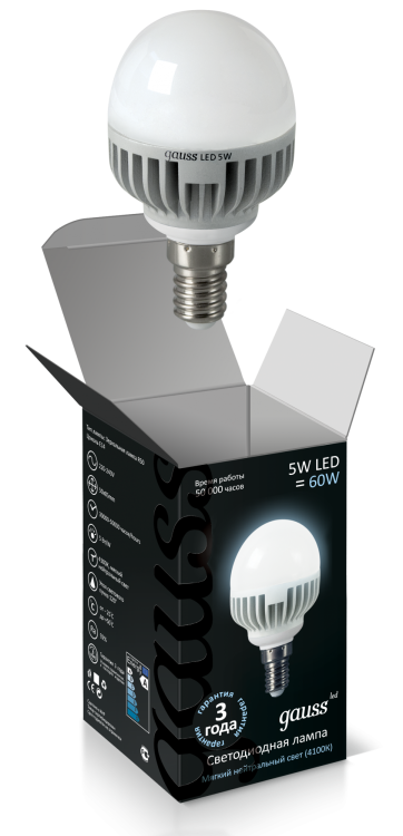 Лампа Gauss LED ШАР, мощность 5Вт, цоколь E14, цветность 4100K
