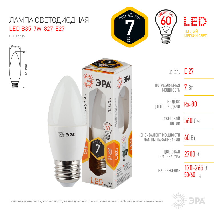 *ЛАМПА ЭРА LED smd B35-7w-827-E27 (6/60/2640) (кр.6шт) | Б0017206