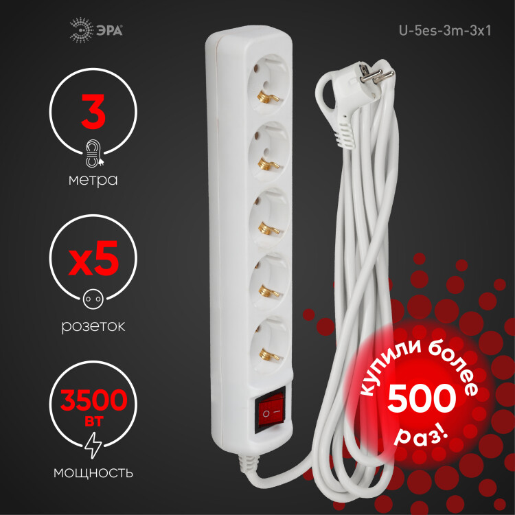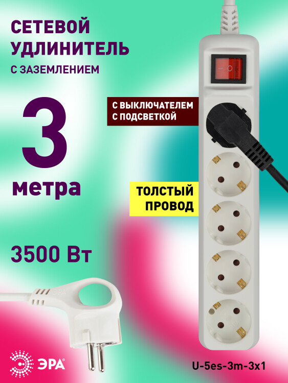 Удлинитель электрический Эра U-5es-3m-3x1 с заземлением, с выключателем, ПВС, 3x1мм2, 5 розетки, 3 м. Рассчитан на максимальную мощность 16А/3500 Вт. Удлинитель Эра станет Вашим надежным помощником, если Ваши любимые электроприборы находятся далеко от розеток. Провод в удлинителях Эра сделан из 100% меди, что делает его абсолютно пожаробезопасным. Корпус выполнен из ударопрочного и негорючего пластика (полипропилен). В моделях с заземлением у вилки есть кольцо для удобного извлечения из розетки. Модель удлинителя на 16А позволяет подключить мощные бытовые приборы общей нагрузкой до 3500Вт. Не бойтесь включить чайник, обогреватель, микроволновку или другие электроприборы. Толстый провод удлинителя Эра гарантирует полную безопасность. Дизайн удлинителя разработан в России командой Эра Style.