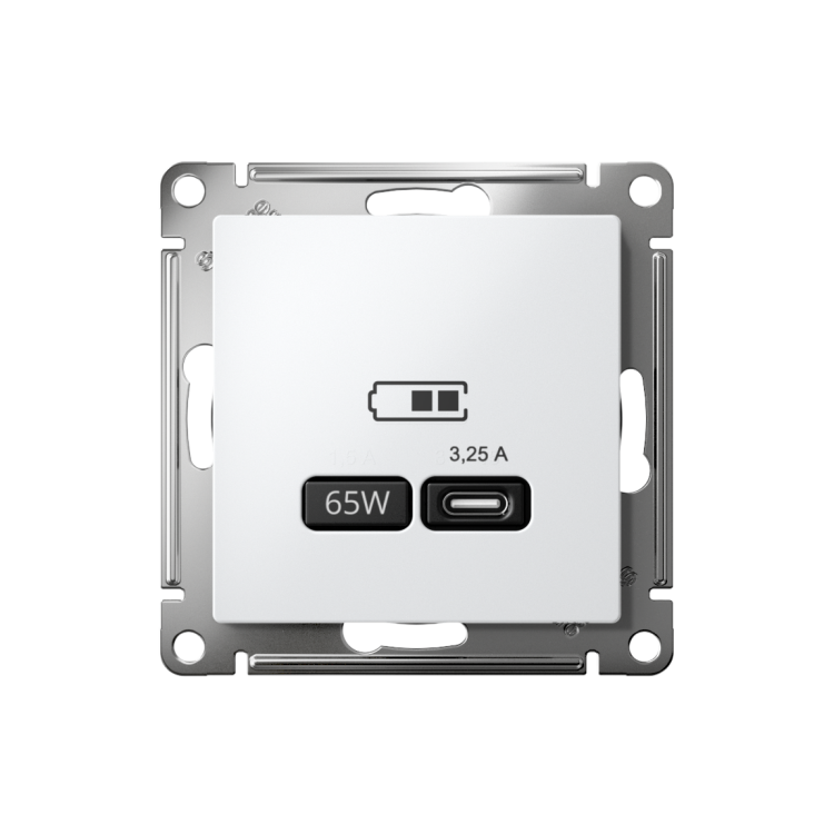 Розетка Systeme Electric (ранее Schneider Electric) серии AtlasDesign в цвете белый USB с разъемом типа C высокоскоростная. Пл астик с ионами серебра обеспечивает антибактериальный эффект. Самая современная USB-зарядка позволяет заряжать ноутбук, а также смартфоны последнего поколения, которые поддерживают функцию быстрой зарядки. Мощность: тип-С - 65Вт. Поддерживает современные протоколы быстрой зарядки QC, PD, последних версий. Лицевые детали из качественного ABS-пластика, устойчивого к царапинам и УФ-излучению.