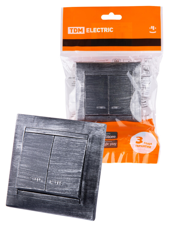 Выключатель 2 кл. с подсветкой 10А старинное серебро "Лама" TDM (кр.10шт)