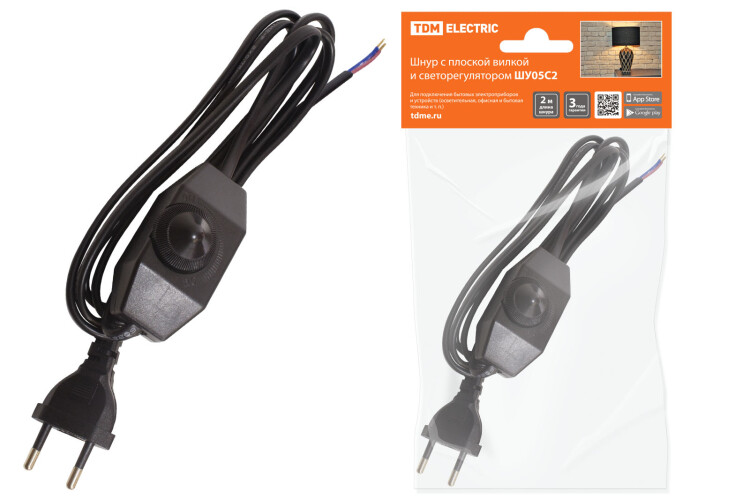 Шнур с плоской вилкой и светорегулятором ШУ05С2 (200Вт, RL) ШВВП 2х0,75мм2 2м. черный TDM (кр.1шт)