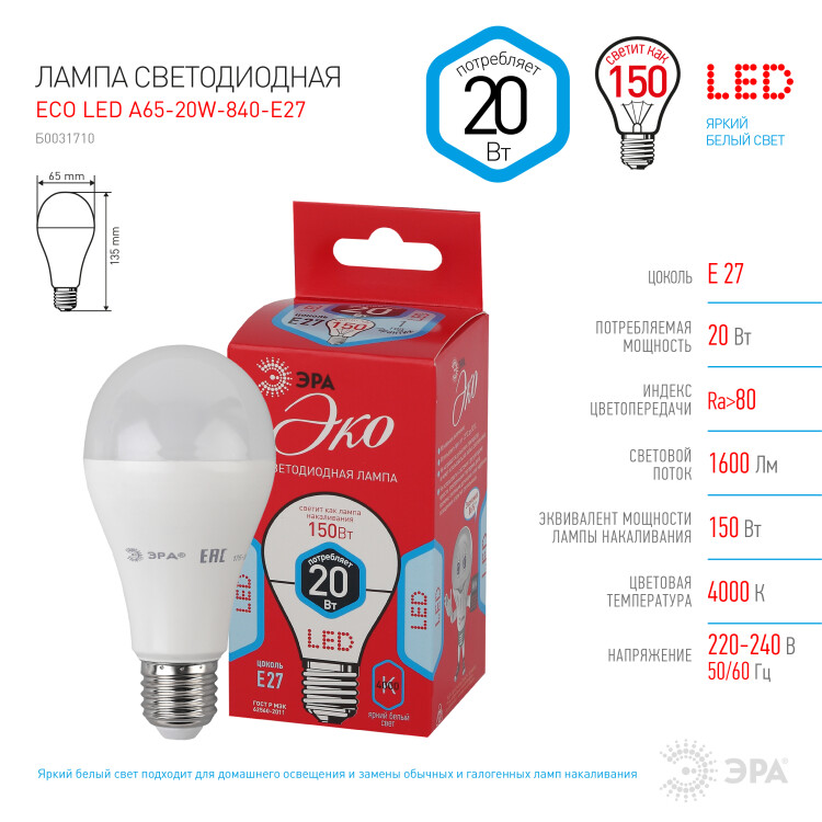 Эта светодиодная лампа ЭРА Серии Бюджет - современный, качественный и доступный источник света. Позволяет экономить до 90% электроэнергии по сравнению с лампой накаливания с аналогичным световым потоком. Светит ярким белым светом, который максимально приближен к естественному дневному. Идеальна для ежедневного применения в быту. Мгновенное включение. Ровное освещение. Можно использовать как с люстрами, так и со светильниками, в том числе настольными и бра.