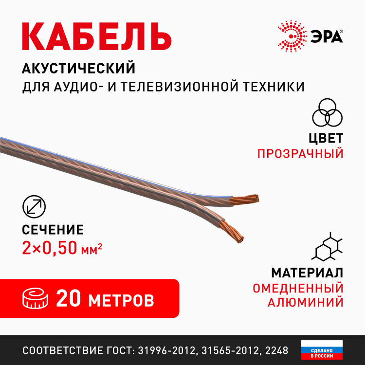 Акустический кабель Эра служит для передачи звукового сигнала в различных аудио системах.Широко применяется для подключения акустических инсталляций в торговых центрах, аэропортах, гостиницах, отелях, системах безопасности и просто не заменим при подключении домашних и автомобильных аудио систем. Конструкция кабеля в разрезе напоминает цифру восемь, два параллельных многожильных проводника покрытых изоляционным слоем из высоко качественного поливинилхлоридного пластиката соединённых между собой. Такая конструкция позволяет разделять проводники между собой без повреждения изоляционного слоя. Проводники выполнены из тонких алюминиевых жил покрытых слоем высокоочищенной бескислородной меди скрученных между собой.Акустический кабель ЭРА обладает высокими показателями придачи звукового сигнала, повышенной гибкостью и устойчивость к притиранию, сочетает в себе высокое качество по приемлемой цене.