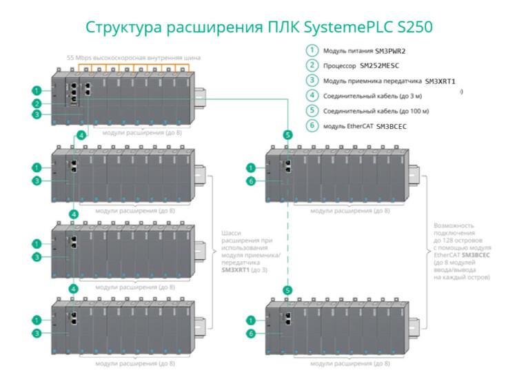Модуль связи серии SystemePLC S250 с 2 портами XRT/RJ-45 для подключения шины контроллера, напряжением питания 24 В постоянного тока