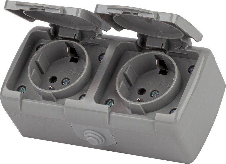 Розетка Intro Atlantic 5-204-03 двойная с заземлением 2х2P+E Schuko шторки, 16А-250В, IP54, открытой установки, серый (кр. 1шт)