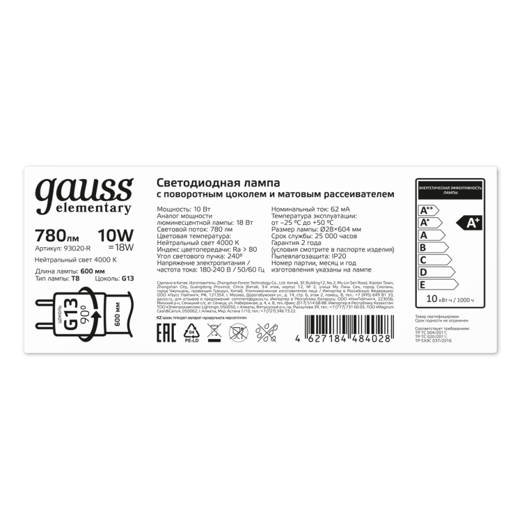 Лампа Gauss Elementary T8 10W 780lm 4000K G13 600mm стекло поворотная LED 1/30