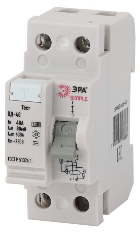 SIMPLE-mod-43 ЭРА SIMPLE Устройство защитного отключения УЗО ВД-40 2P 40А/30мА (электронное) (100/3 (кр. 1шт)
