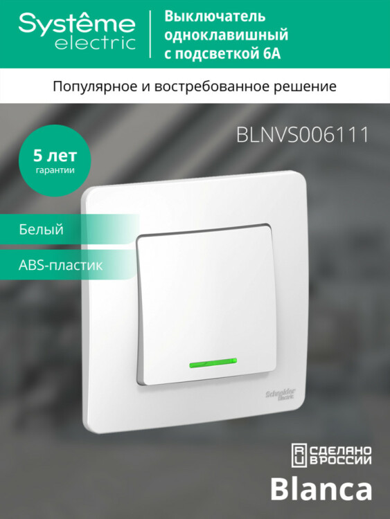 Выключатель Systeme Electric (ранее Schneider Electric) BLANCA (белый, скрытой установки) одноклавишный предназначен для сетей до 250В, на ток до 6А. Подсветка делает его легко находимым в отсутствие освещения. Выключатель подходит для небольших светильников и бра.