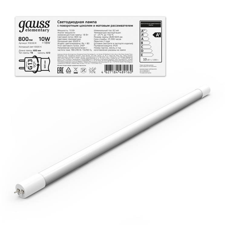 Лампа Gauss Elementary T8 10W 800lm 6500K G13 600mm стекло поворотная LED 1/30