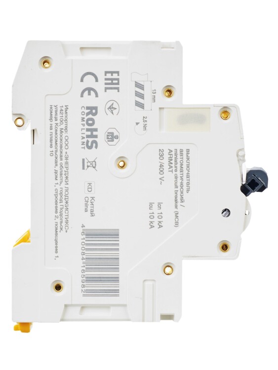 Автоматические выключатели ARMAT серии M10N предназначены для защиты цепей от перегрузки и короткого замыкания. Модельный ряд включает в себя устройства с характеристиками срабатывания B, C, D и номинальными токами от 0,5 до 63 А. Номинальная отключающая способность автоматических выключателей ARMAT серии M10N составляет 10 кА. Предельная отключающая способность варьируется в зависимости от номинала от 10 до 50 кА.