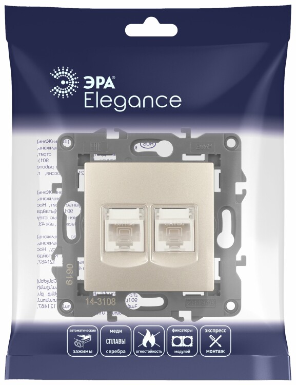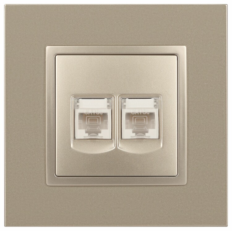 Розетка информационная двойная 2XRJ45 сер ии Эра Elegance скрытой установки цвет шампань 14-3108-04. Выполенена из поликарбоната.
