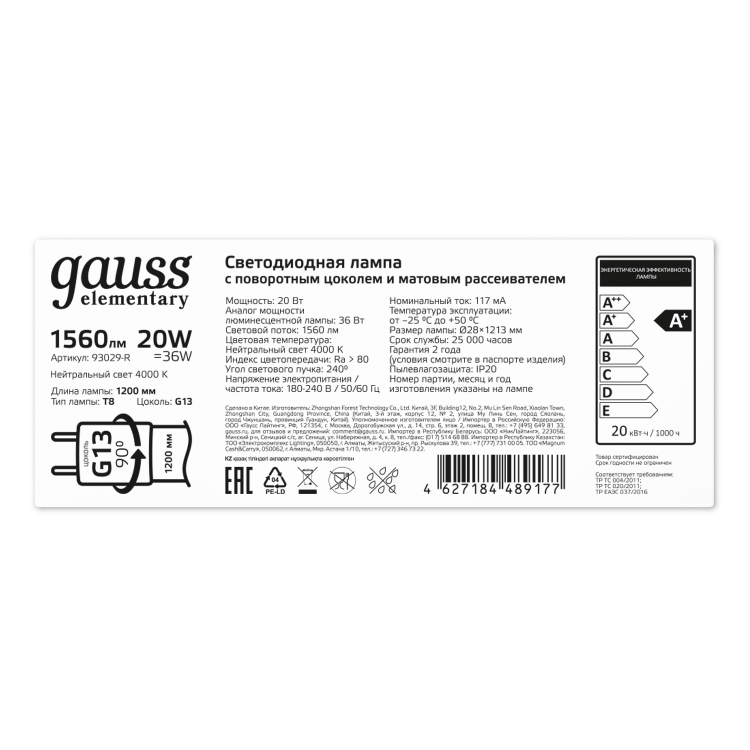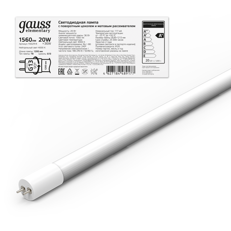 Лампа Gauss Elementary T8 20W 1560lm 4000K G13 1200mm стекло поворотная LED 1/30
