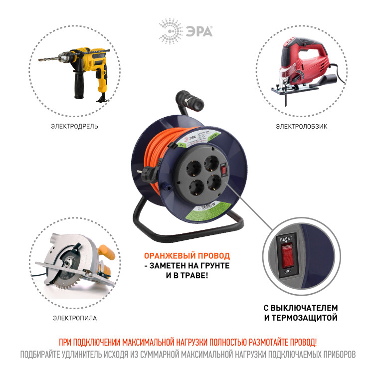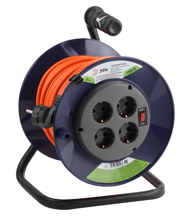Удлинитель силовой на пластиковой катушке ЭРА RPx-4es-3х0.75-30m с заземлением, с выключателем, ПВС 3х0,75м2, 4 розетки, 30 м. Мощность 6А/1300Вт. Используется для работы на строительных площадках или дачных участках. Удобен при работе с приборами находящимися удаленно от стационарной розетки. Например, газонокосилки, электрические, пилы, триммеры или электродрели. Провод в удлинителях Эра сдела н из 100% меди, что делает его абсолютно пожаробезопасным. Рама удлинителя сделана из высокопрочной стали а пластиковой корпус выполнен с применением негорючих добавок.