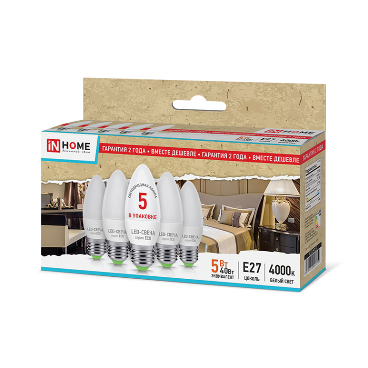 Лампа светодиодная LED-СВЕЧА-ECO 5Вт 230В Е27 4000К 375Лм (5шт в упаковке) IN HOME (кр.20упак)