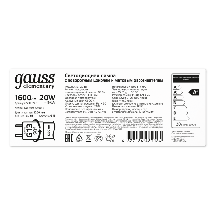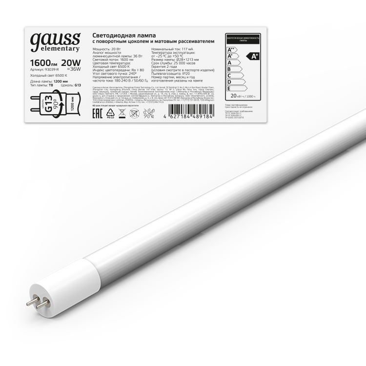 Линейные лампы Gauss T8 с цоколем G13 - выгодная замена стандартных люминесцентных ламп. Замена безопасна и не требует менять светильники – длина ламп светодиодных соответствует установленным стандартам