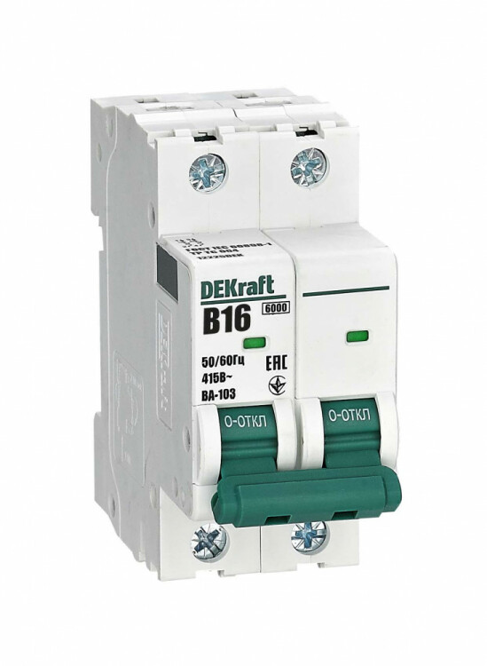 Автоматический выключатель серии ВА-103 NEW DEKraft; 2P; номинальный ток 16 А; характеристика B; отключающая способность 6 кА, что позволяет использовать аппараты в качестве вводных. 5 монолитных заклепок повышают прочность корпуса аппарата. Окошко-индикатор всегда показывает состояние контактов вне зависимости от положения рукоятки управления. Боковые каналы охлаждения повышают стабильность работы при высоких температурах окружающей среды. Есть возможность установки дополнительных аксессуаров с левой стороны устройства. Аппарат на 100% совместим с корпусами и оболочками DEKraft, Systeme Electric.