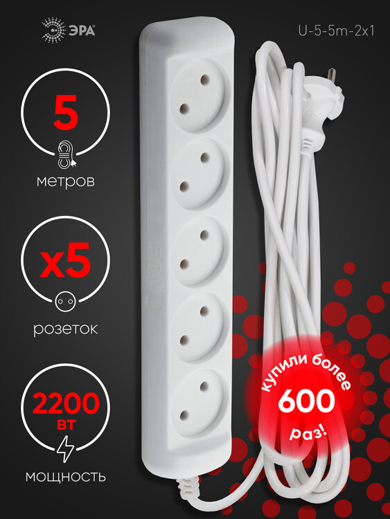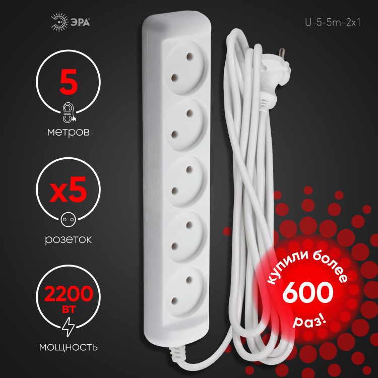 Удлинитель электрический Эра U-5-5m без заземления, ПВС, 2x1мм2, 5 розеток, 5м. Рассчитан на максимальную мощность 10А/2200 Вт. Удлинитель Эра станет Вашим надежным помощником, если Ваши любимые электроприборы находятся далеко от розеток. Провод в удлинителях Эра сделан из 100% меди, что делает его абсолютно пожаробезопасным. Корпус выполнен из ударопрочного и негорючего пластика (полипропилен). В моделях с заземлением у вилки есть кольцо для удобного извлечения из розетки. Модель удлинителя на 10А позволяет подключить мощные бытовые приборы общей нагрузкой до 2200Вт. Не бойтесь включить чайник, обогреватель, микроволновку или другие электроприборы. Толстый провод удлинителя Эра гарантирует полную безопасность. Дизайн удлинителя разработан в России командой Эра Style.