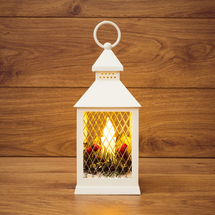 Декоративный фонарь со свечкой - эффектное украшение, которое символизирует Рождество и Новый год, поэтому станет запоминающимся подарком к празднику. В белом корпусе наxодится оригинальная композиция с искусственными ветками ели и ягодами остролиста. А главный компонент - свеча, внутри которой спрятан 1 диод, излучающий теплый белый свет. Декоративный фонарь работает от 3 батареек типа ААА, включается и выключается при помощи кнопки на корпусе. Изделие предназначено для использования в интерьере.