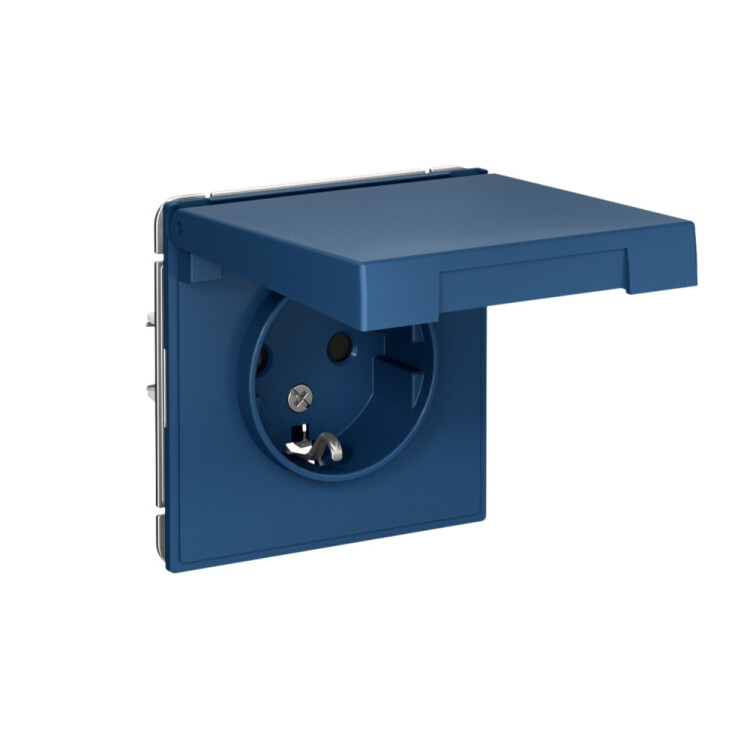 Механизм Systeme Electric серии ArtGallery в цвете аквамарин розетки одинарной с заземлением, шторками и крышкой подходит для сетей 250 В, на ток 16 А.