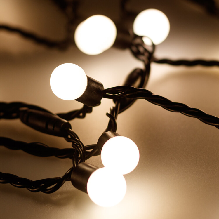 Светодиодные шарики Classic. Разме р 10000 мм. Цвет свечения ТЕПЛЫЙ БЕЛЫЙ (3000 К), постоянное свечение. 100 шариков со светодиодом внутри размером 17.5 мм с мягким световым рисунком (выпуклая молочно-белая линза). Провод чёрный, ПВХ. Питание 230 В, Мощность 7 Вт, защита IP65, применение в помещении и на улице под навесом. Аксессуары для подключения приобретаются отдельно.