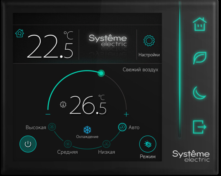 Комнатный контроллер SystemeComf для управления микроклиматом, освещением и солнцезащитными системами (шторами или жалюзи) в помещении, корпус черного цвета, цветной сенсорный экран с поддержкой жестов, встроенный датчик температуры, порт RS-485 для интеграции в BMS как ведомое устройство Modbus RTU, порт RS-485 для подключения модулей расширения, напряжение питания 230 В переменного тока, установка на стене помещения в коробку BS (не входит в комплект поставки) глубиной 50 мм