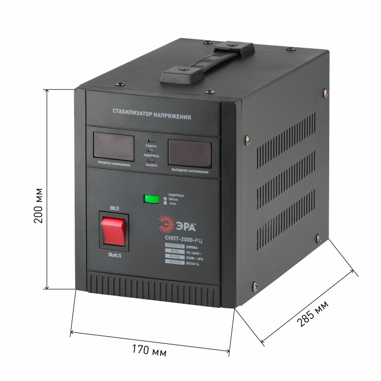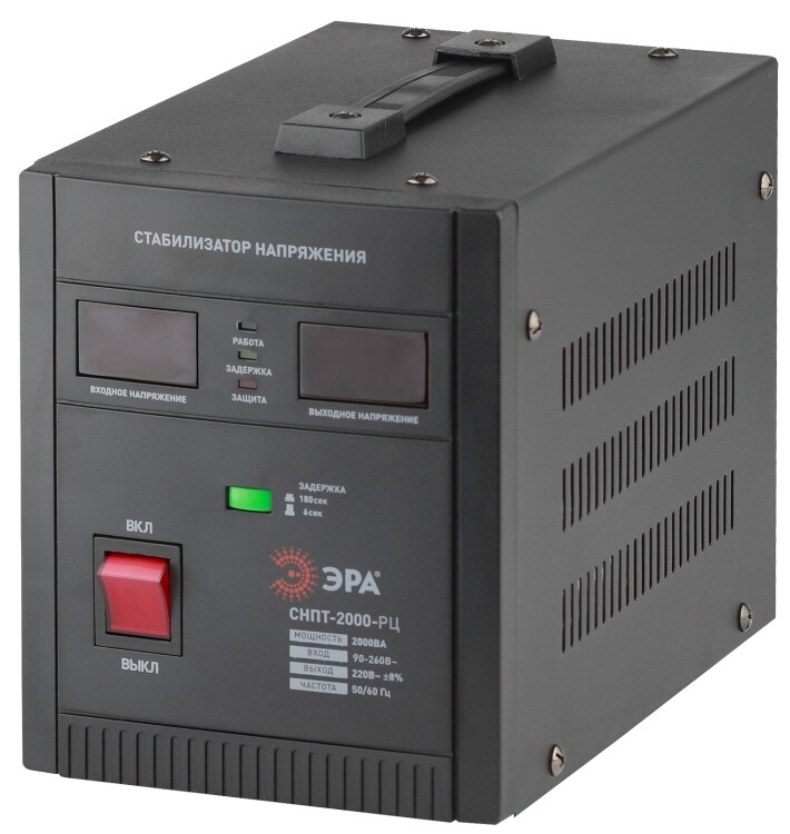 Стабилизатор напряжения переносной /напольный однофазный релейный цвет чёрный модели СНПТ-2000-РЦ. Номинальные характеристики (полная мощность / диапазон входного напряжения): 2000ВА. Предназначен для поддержания стабильного однофазного напряжения питания бытовых приборов при отклонениях значений сетевого напряжения. Выбирая стабилизатор, нужно знать, какое электрооборудование будет к нему подключено: один прибор, группу приборов (наиболее чувствительных к перепадам напряжения в сети) либо вся домашняя (офисная) техника. Затем необходимо рассчитать суммарную мощность защищаемых электропотребителей. Основное условие выбора мощности стабилизатора напряжения - суммарная мощность подключаемой к нему нагрузки не должна превышать полной мощности самого стабилизатора (в противном случае автоматика стабилизатора будет их просто отключать). Точные значения мощности можно узнать из паспортных данных Вашего конкретного потребителя. Стабилизатор подбирается с запасом в 25-30% к его полной мощности.