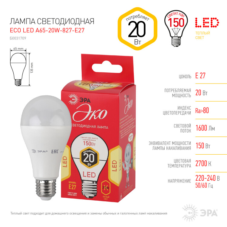 Лампочка светодиодная ЭРА RED LINE ECO LED A65-20W-827-E27 E27 / Е27 20Вт груша теплый белый свет (кр. 1шт )