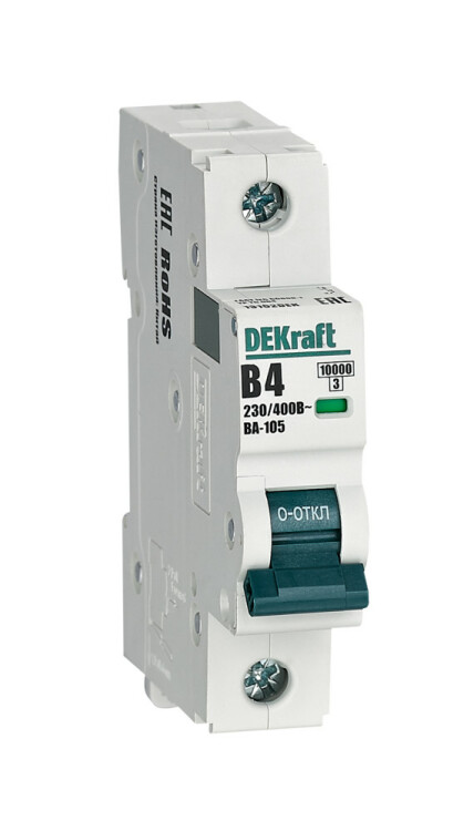 Автоматический выключатель серии ВА-105 DEKraft; 1P; ном. ток 4 А; характеристика В; откл. способность 10 кА; ширина модуля 18 мм. Аппараты имеют механизм мгновенной коммутации, 6 монолитных заклепок, которые повышают прочность корпуса. Боковые каналы охлаждения повышают стабильность работы при высоких температурах окружающей среды. Есть возможность установки дополнительных аксессуаров с левой стороны устройства. Аппарат на 100% совместим с корпусами и оболочками DEKraft и Systeme Electric.