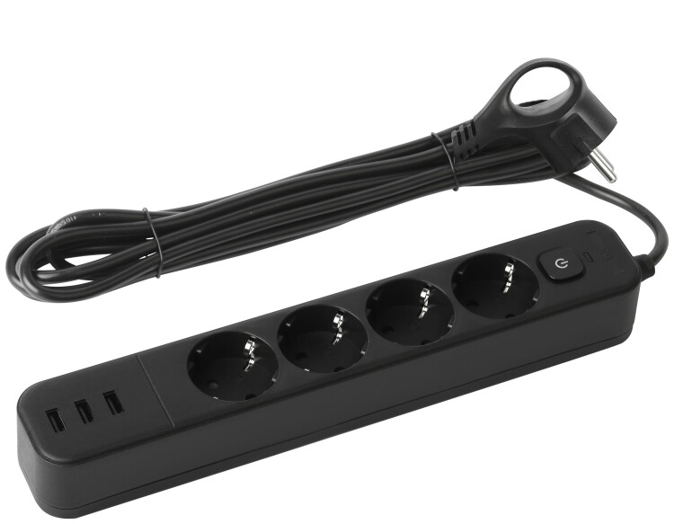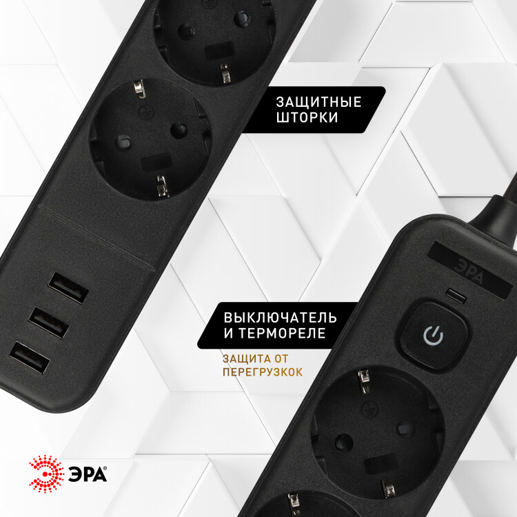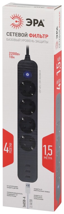 Сетевой фильтр ЭРА USF-4es-1,5m-3xUSBA-B с заземлением, с выключателем, 4 розетки, 3USB, провод 1,5 м, ПВС 3x0,75мм2. Базовый уровень защиты техники: от импульсных помех, от перегрузки, от короткого замыкания. Максимальная мощность 10А/2200 Вт. Корпус из негорючего пластика (полипропилен). Вилка обеспечена кольцом для удобного извлечения ее из розетки. Выключатель со световой индикацией позволяет выключить все приборы, подключенные к сетевому фильтру, не вынимая вилки из розетки. Отлично подойдет для защиты бытовой и компьютерной техники. Сетевой фильтр оснащен 3USB для зарядки мобильных устройств.