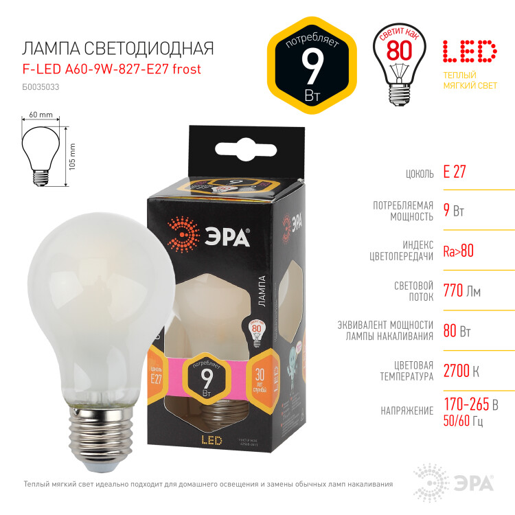 Лампочка светодиодная ЭРА F-LED A60-9W-827-E27 frost Е27 / E27 9Вт филамент груша матовая теплый белый свет (кр. 1шт)