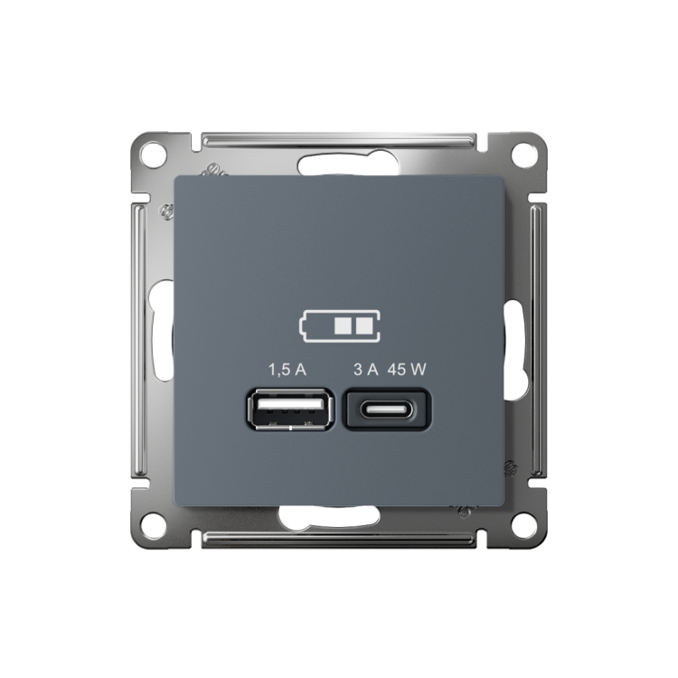 Розетка Systeme Electric (ранее Schneider Electric) серии AtlasDesign в цвете грифель двойная USB с разъемами типа A+C высокоскоростная. Самая современная USB-зарядка с двумя разъемами позволяет заряжать как стандартные мобильные устройства через разъем типа А, так и новейшие устройства с разъемом типа С. Позволяет заряжать смартфоны последнего поколения, которые поддерживают функцию быстрой зарядки. Мощность: тип-A – 7.5 Вт, тип-С - 45Вт. Поддерживает современные протоколы быстрой зарядки QC, PD, последних версий. Лицевые детали из качественного ABS-пластика, устойчивого к царапинам и УФ-излучению.