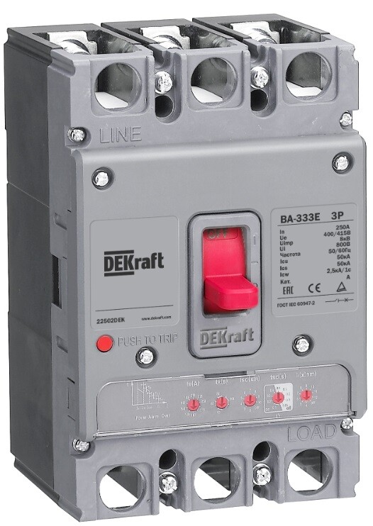 Автоматические выключатели в литом корпусе серии ВА-333Е DEKraft; с электронным расцепителем; 3P; ном. напряжение 400/415 В; ном. ток 125 А; Uimp = 8 кВ. Автоматические выключатели в литом корпусе ВА-333Е имеют категорию применения B; отличаются эффективным гашением дуги, расширенным диапазоном рабочих температур, безопасностью и удобством, возможностью установки до трех доп. функций, наличием индикации состояния электронного расцепителя и широким выбором уставок. В комплект поставки входят межфазные перегородки.