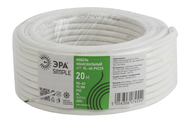 ЭРА Кабель коаксиальный RG-6U, 75 Ом, CCS/(оплётка Al 48%), PVC, цвет белый, бухта 20 м, SIMPLE (20/360) (кр. 1шт)