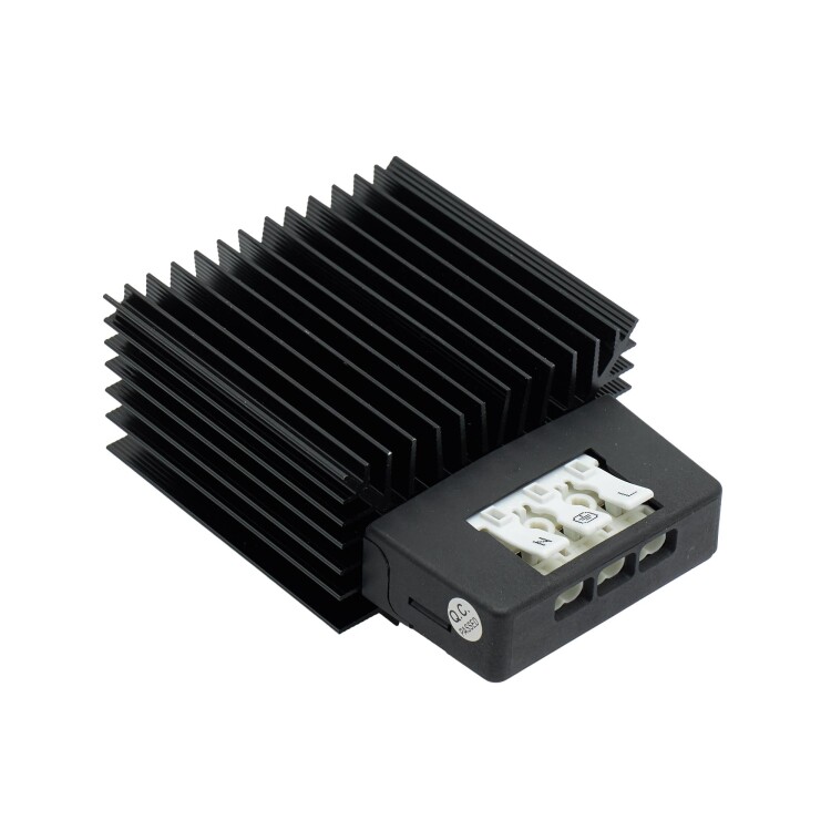 Обогреватель в черном алюминиевом корпусе мощностью 15 Вт предназначен для поддержания необходимой температуры внутри электротехнического шкафа. Работает от напряжения 48 В постоянного напряжения. Обогреватель изготовлен из высококачественных материалов, обеспечивающих надежную работу. Степень защиты – IP20. Благодаря компактным размерам 50x70x97 мм этот обогреватель легко устанавливается в ограниченном пространстве. Рабочий диапазон температур от –45 до +70 ˚C делает его подходящим для использования в суровых условиях эксплуатации. Обогреватель оснащен нагревательным элементом РТС-типа, что обеспечивает стабильную и долговечну ю работу.